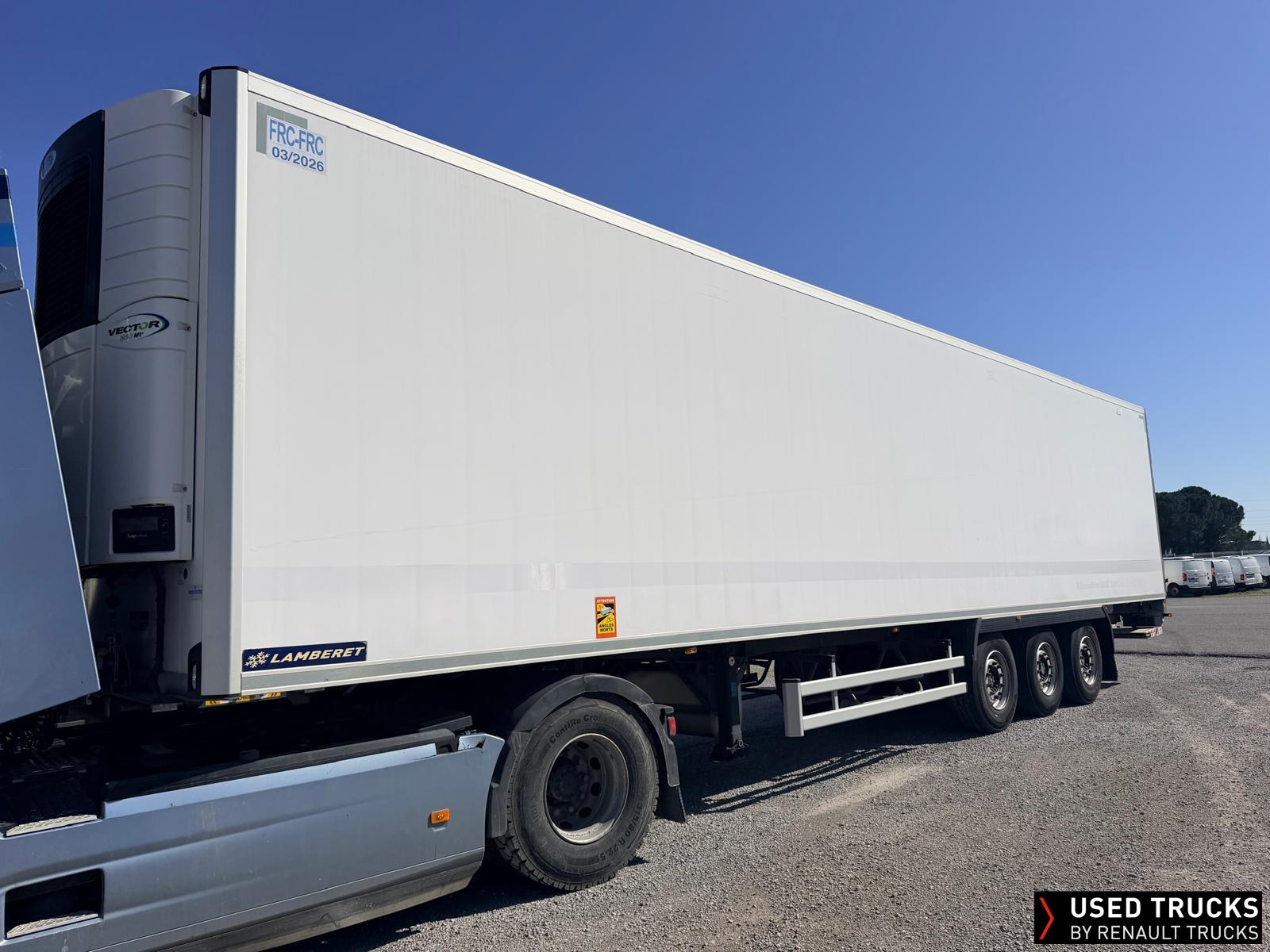 SEMI FRIGO / LAMBERET / SR2B 5T8 2B / 3 ESSIEUX / GROUPE FRIGO CARRIER VECTOR / 8 136 H DIESEL / 2 395 H SECTEUR / 18 026 H TOTAL / DOUBLE EVAPORATEUR ARRIERE / GRILLE VENTILLATION AVANT / CLOISON MOBILE / 2 RAILS D'ARRIMAGE / ECHELLE COULISSANTE / HAYON RETRACTABLE ANTEO 1,7T / PLATEFROME 1,60 X 2,50M / frc 03/2026