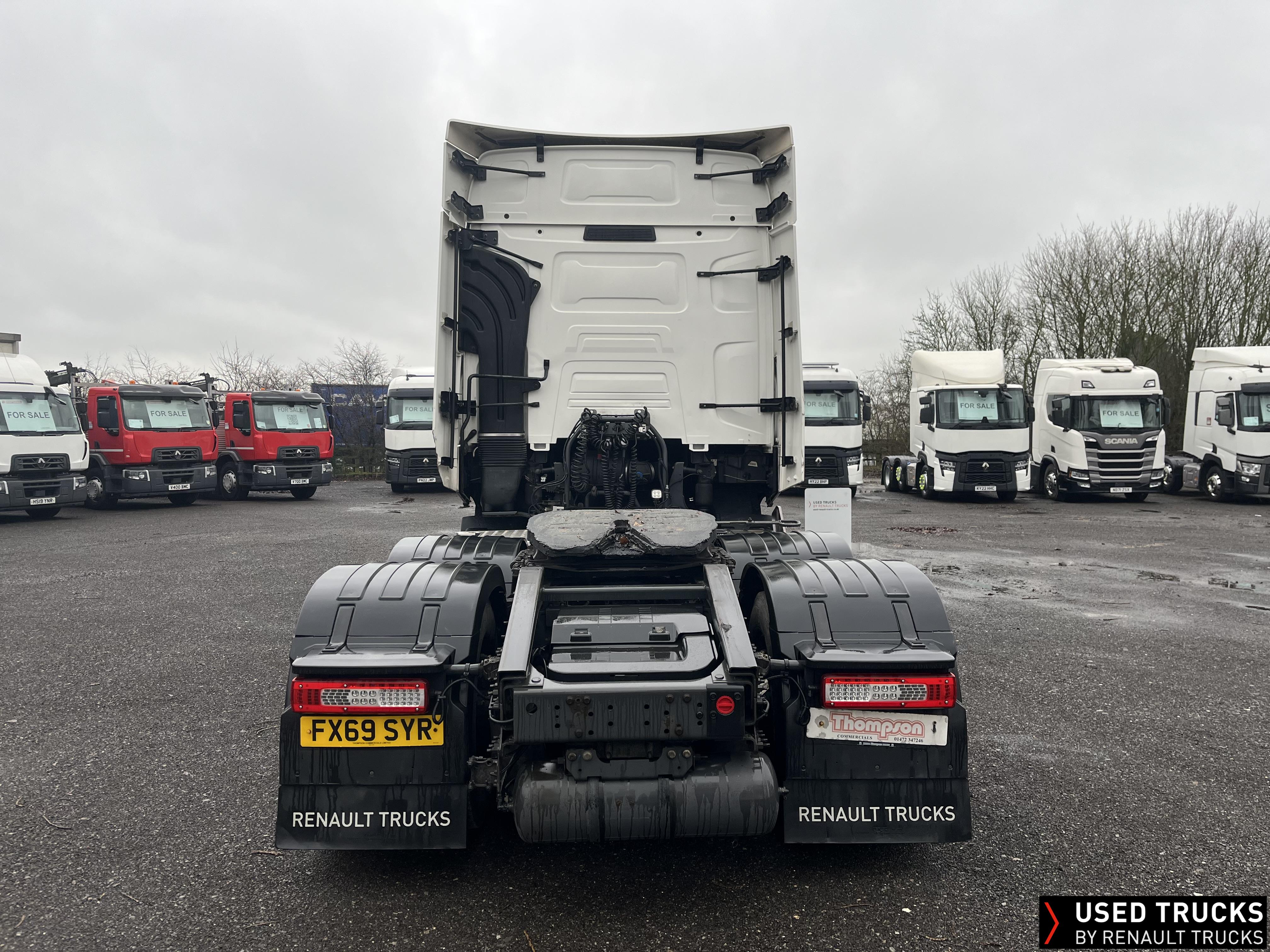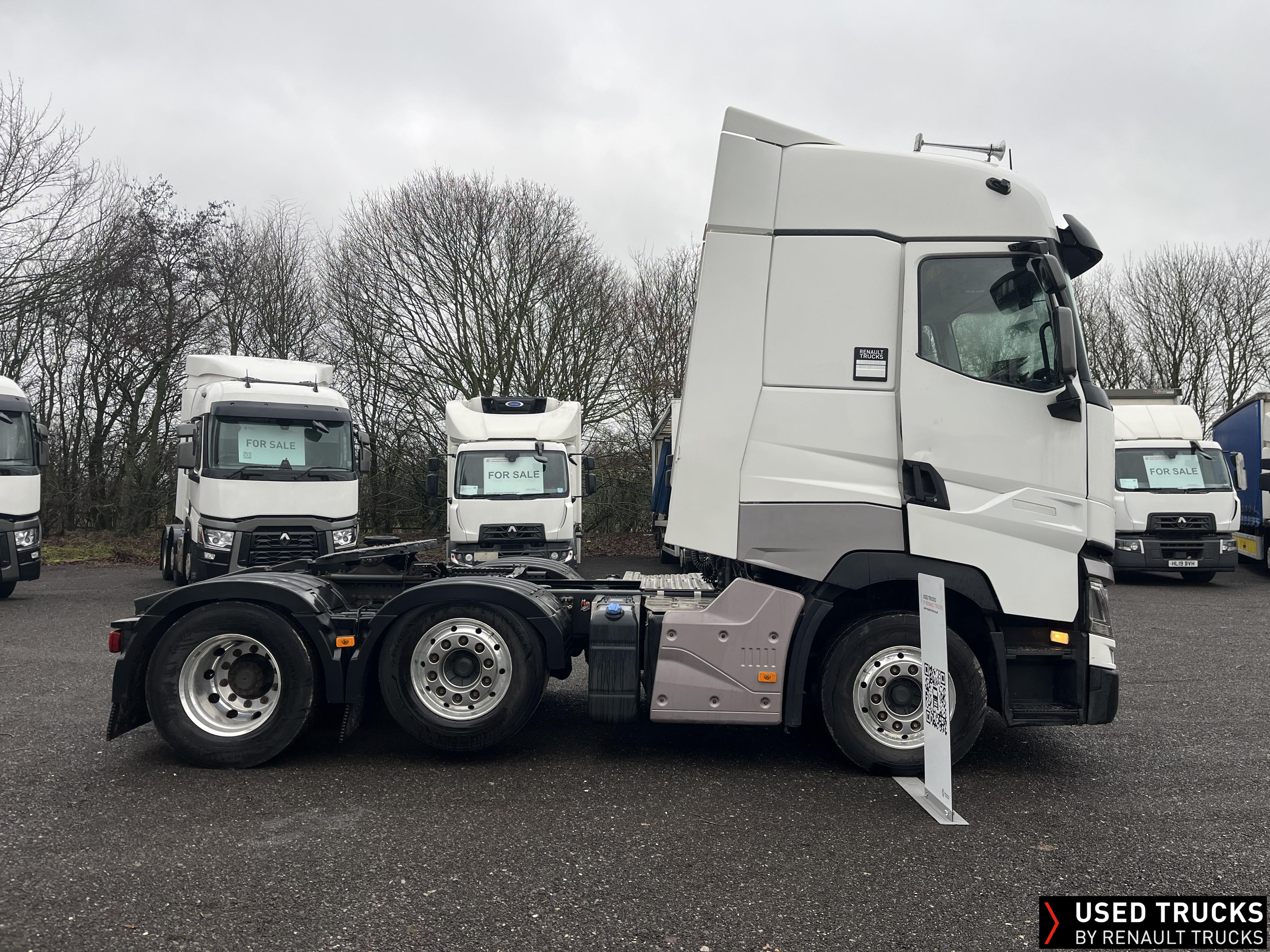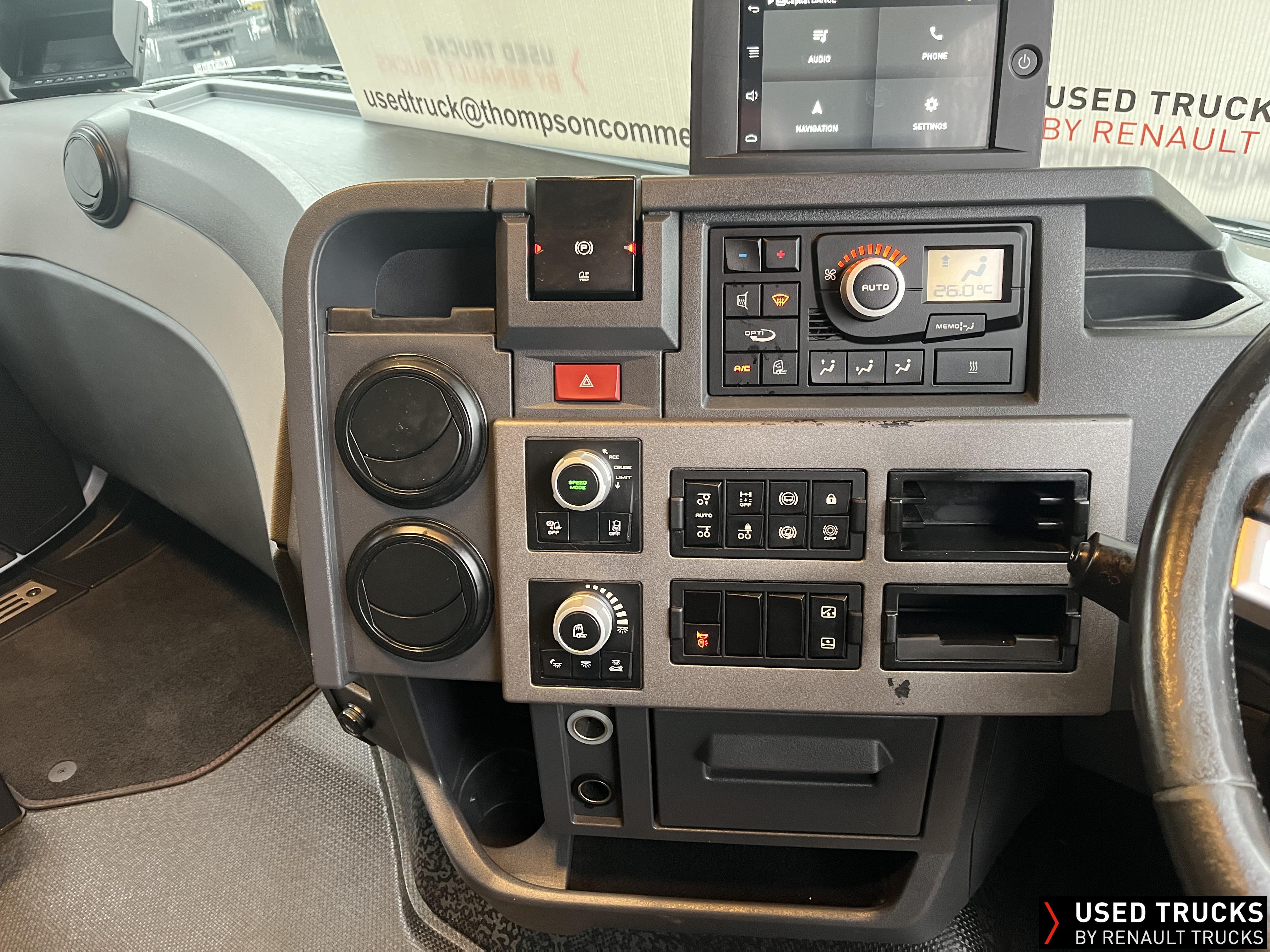 2019 (69) Renault T HIGH 520.26 TML 6x2 Tractor Unit, with just 784,132kms. T HIGH Flat Floor Sleeper Cab, 13 LTR 520 BHP Euro 6 Engine & Automatic Gearbox, Engine Brake, 4-Point Cab Air Suspension, Sunvisor, Cruise Control with Optiroll, Lane Departure Warning System, Emergency Brake Assist, Electronically Regulated Comfort Air Conditioning, Full Air Deflector Kit, Electric Windscreen Sunblind, Drawer under Bunk with 40 Litre Fridge, Microwave, Alcoa Dura bright Alloy Wheels, LED Cab Lighting, Remote Control in Bunk Area for Cab Controls, FM/DAB+ Radio with Bluetooth, USB Port & Jack Socket, 4 Loudspeakers & 2 Tweeters. One-Touch Electric Windows, 12/24V Sockets, Sliding 5th Wheel, LED Rear Lights, LED Day Running Lights & LED Work Light, Front Fog Lights, Automatic Lights & Wipers.