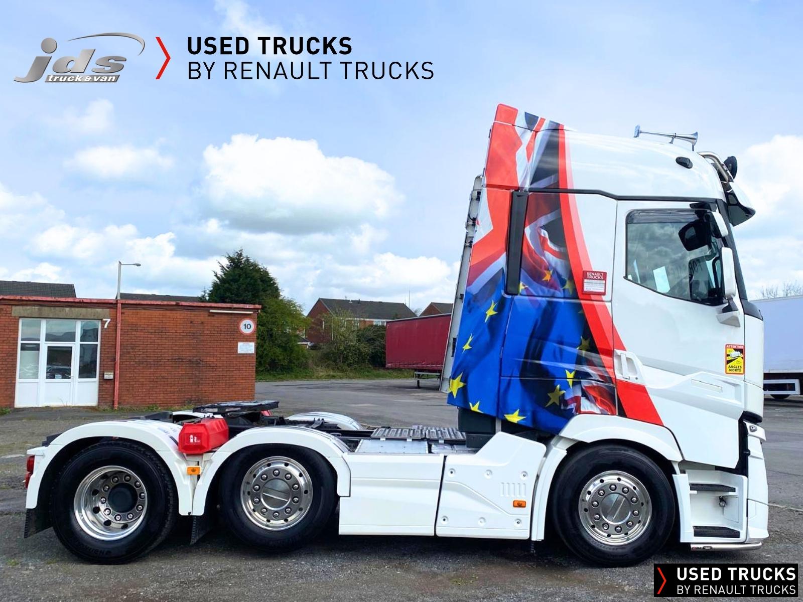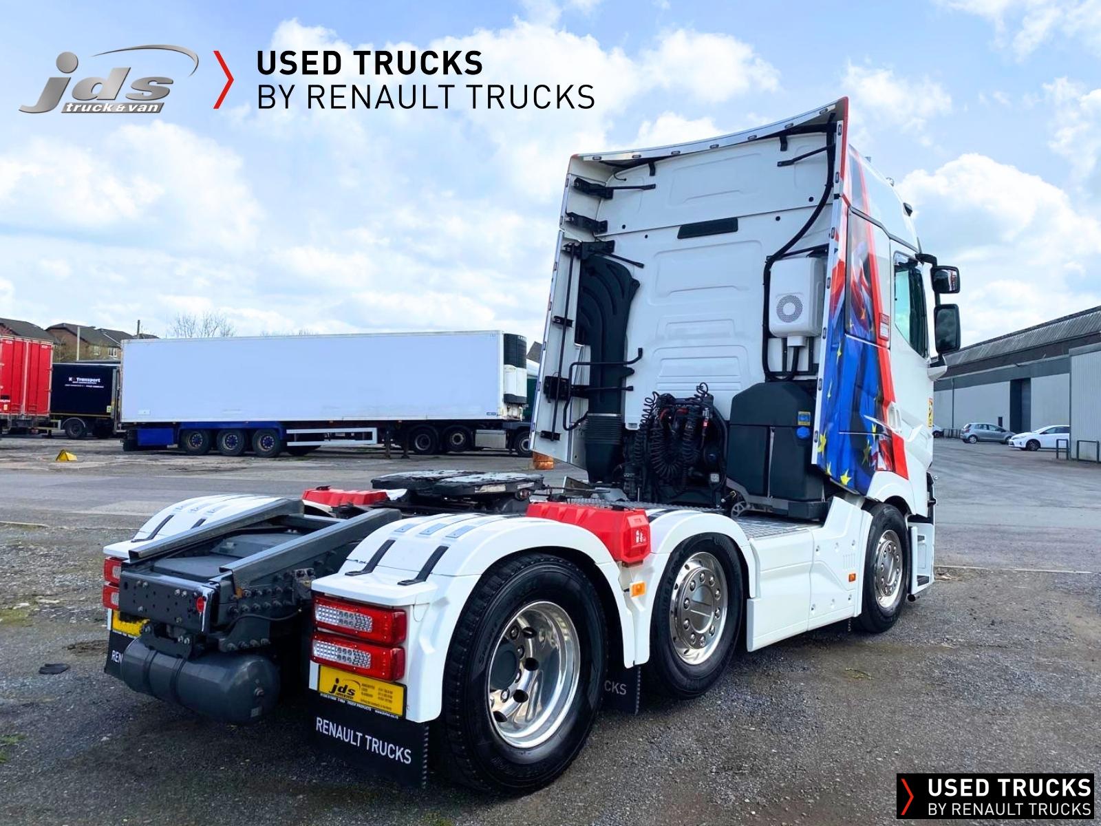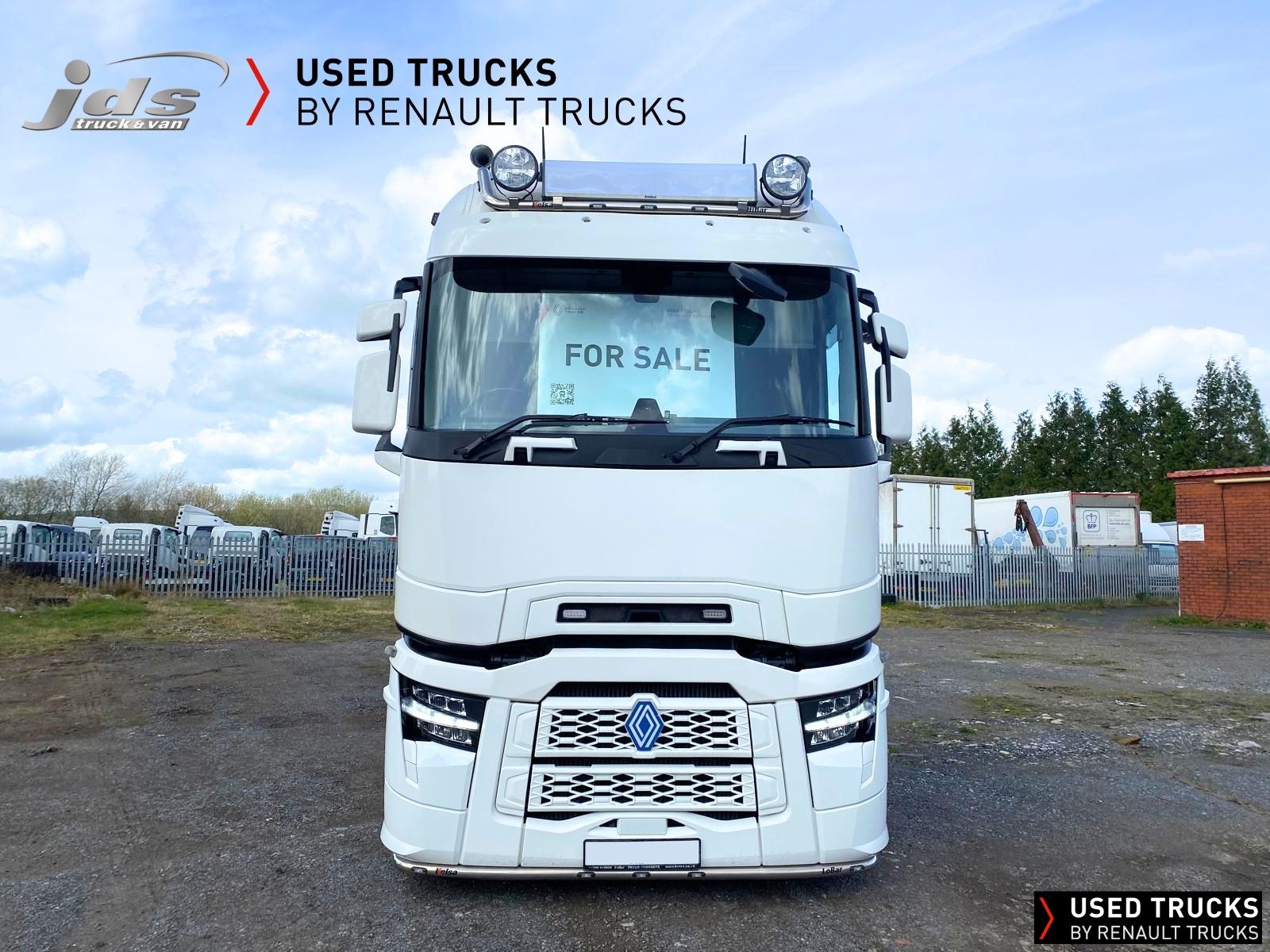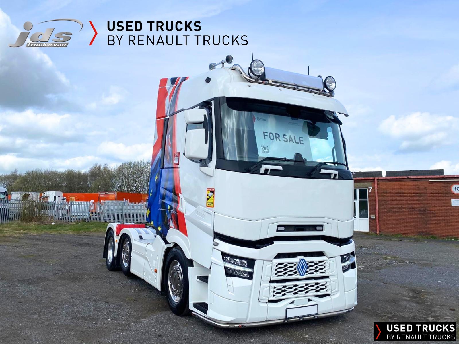 2023 (23) Renault Trucks T HIGH 520.26 TML Evolution 6x2 Midlift Tractor Unit. Sold New by JDS Trucks & Maintained on a Renault Full Repair & Maintenance Contract with just 294,705 kms. Absolutely Amazing Specification with Front Air Suspension, 4100mm Wheelbase, 8-tonne Front Axle with Super-Singles on both Steer Axles, Colour Coded T HIGH Flat-Floor Sleeper Cab, 13 Litre DE13 520 BHP Euro 6 Engine & Automatic Gearbox, Engine Brake, 4-Point Cab Air Suspension, Alcoa Dura-Bright Alloy Wheels, Electric Cab Tilt, Sunvisor, Adaptive Cruise Control (ACC) with ECO Optiroll, Lane Departure Warning System, Emergency Brake Assist, Electronically Regulated Comfort Air Conditioning, Full Air Deflector Kit, Leather Seats, Electric Windscreen Sunblind, Heated Remote Control Mirrors, Luxury Heated Ventilated Driver's Seat with 2 Armrests, Air Suspended Passenger seat with 2 Armrests, Ultimate Leather Steering Wheel, Drawer under Bunk with 40 Litre Fridge, LED Cab Lighting, Remote Control in Bunk Area for Cab Controls, ROADPAD+ System with HGV Sat Nav, , FM/DAB+ Radio with Bluetooth, USB Port & Jack Socket, 4 Loudspeakers & 2 Tweeters. One-Touch Electric Windows, 12/24V Sockets, Sliding 5th Wheel with Extended Rear Platform, LED Front Headlights, Twin LED Rear Lights, LED Day Running Lights & LED Work Light, Front Fog Lights, Additional Cornering Lights, Automatic Lights & Wipers, Integrated Headlamp Washer, Reverse Warning Buzzer, Metallic Door Sills, Heavy Duty Sediment & Prefilter, Telematics Pre-Equipment, FMS Gateway Fleet Management Interface. Additional Specification includes Parked Air Conditioning Unit, Camera System, Air Horns, Cab Wall Lockers, Microwave, Kelsa HiBar, Kelsa LoBar, Spotlights, Grille Lights, Illuminated Renault Badge, Rear Cab Perimeter Lights & Dutch Headboard & Fire-Extinguisher Boxes. Early Viewing Highly Recommended!