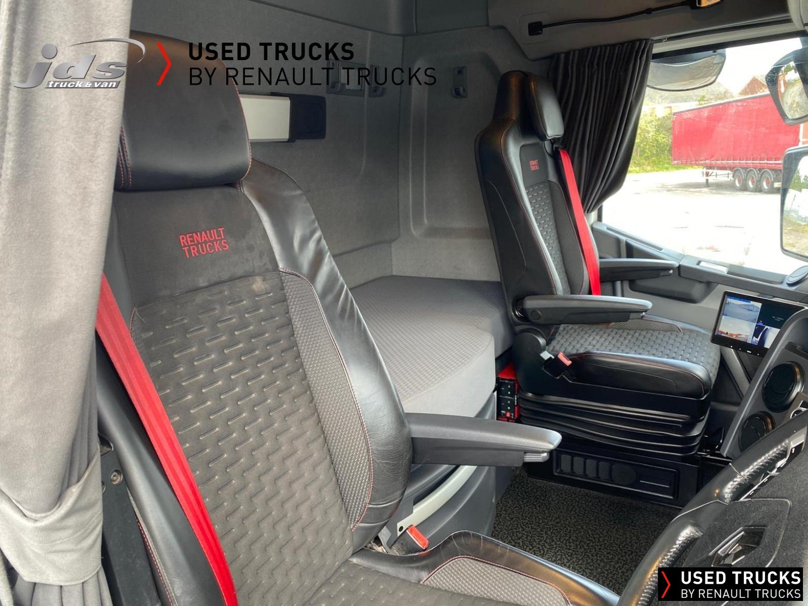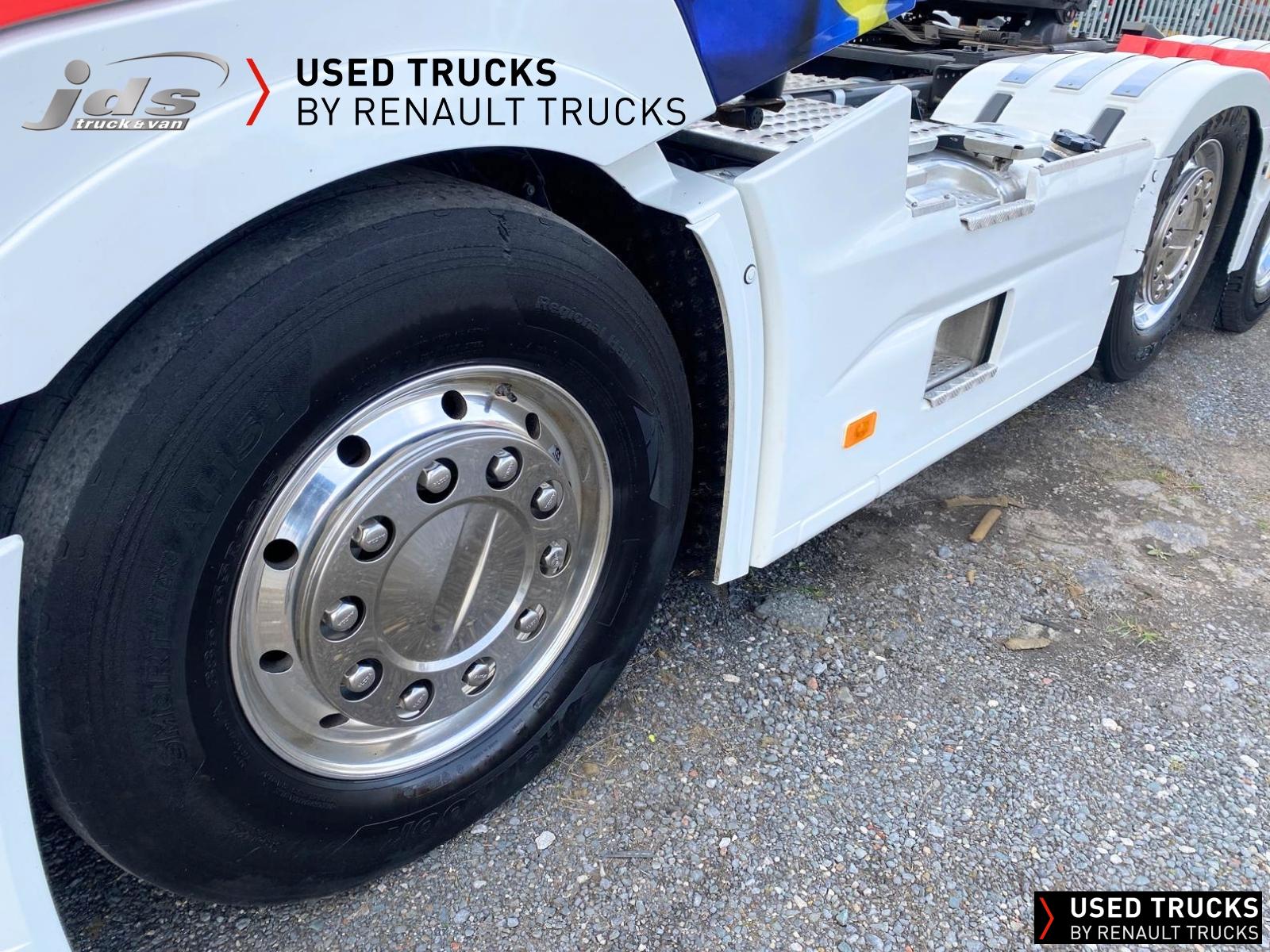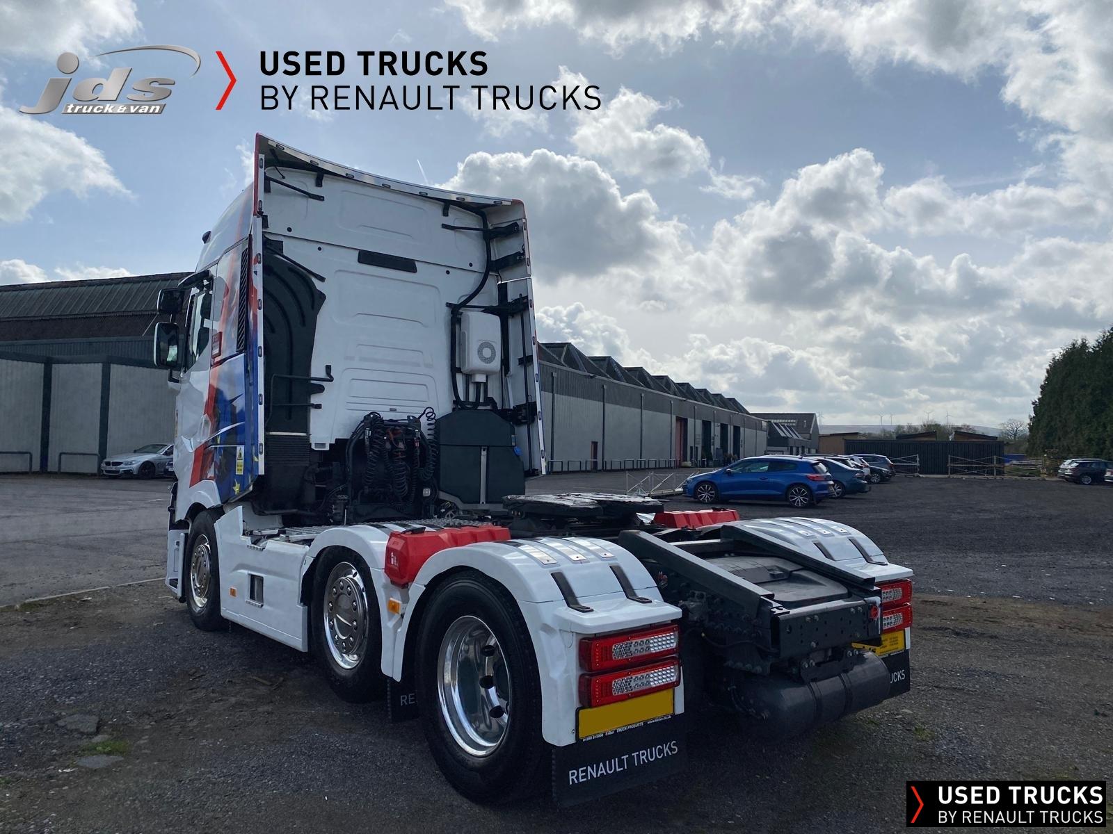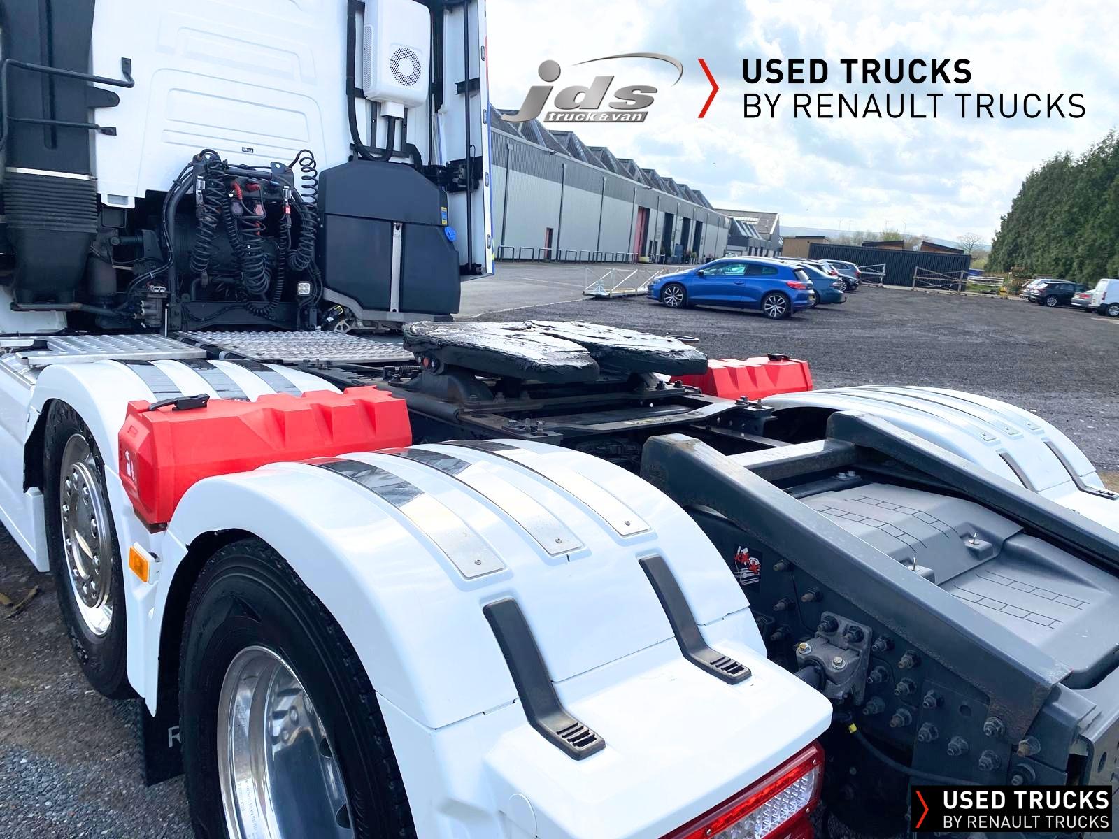 2023 (23) Renault Trucks T HIGH 520.26 TML Evolution 6x2 Midlift Tractor Unit. Sold New by JDS Trucks & Maintained on a Renault Full Repair & Maintenance Contract with just 294,705 kms. Absolutely Amazing Specification with Front Air Suspension, 4100mm Wheelbase, 8-tonne Front Axle with Super-Singles on both Steer Axles, Colour Coded T HIGH Flat-Floor Sleeper Cab, 13 Litre DE13 520 BHP Euro 6 Engine & Automatic Gearbox, Engine Brake, 4-Point Cab Air Suspension, Alcoa Dura-Bright Alloy Wheels, Electric Cab Tilt, Sunvisor, Adaptive Cruise Control (ACC) with ECO Optiroll, Lane Departure Warning System, Emergency Brake Assist, Electronically Regulated Comfort Air Conditioning, Full Air Deflector Kit, Leather Seats, Electric Windscreen Sunblind, Heated Remote Control Mirrors, Luxury Heated Ventilated Driver's Seat with 2 Armrests, Air Suspended Passenger seat with 2 Armrests, Ultimate Leather Steering Wheel, Drawer under Bunk with 40 Litre Fridge, LED Cab Lighting, Remote Control in Bunk Area for Cab Controls, ROADPAD+ System with HGV Sat Nav, , FM/DAB+ Radio with Bluetooth, USB Port & Jack Socket, 4 Loudspeakers & 2 Tweeters. One-Touch Electric Windows, 12/24V Sockets, Sliding 5th Wheel with Extended Rear Platform, LED Front Headlights, Twin LED Rear Lights, LED Day Running Lights & LED Work Light, Front Fog Lights, Additional Cornering Lights, Automatic Lights & Wipers, Integrated Headlamp Washer, Reverse Warning Buzzer, Metallic Door Sills, Heavy Duty Sediment & Prefilter, Telematics Pre-Equipment, FMS Gateway Fleet Management Interface. Additional Specification includes Parked Air Conditioning Unit, Camera System, Air Horns, Cab Wall Lockers, Microwave, Kelsa HiBar, Kelsa LoBar, Spotlights, Grille Lights, Illuminated Renault Badge, Rear Cab Perimeter Lights & Dutch Headboard & Fire-Extinguisher Boxes. Early Viewing Highly Recommended!